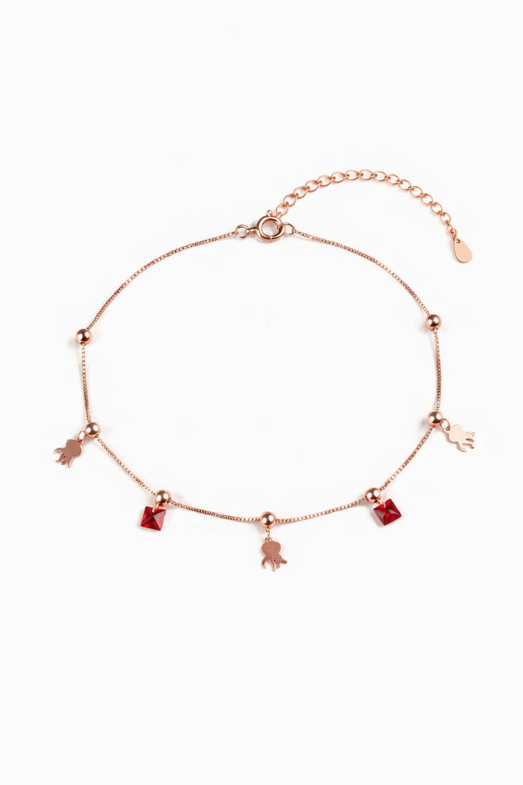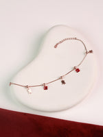 Designed to move with you, the Red Drops Rose Gold Charm Bracelet is made of subtle details that reveal themselves slowly. Delicate rose gold links carry tiny octopus charms and deep red square stones, spaced evenly like little moments along the chain.